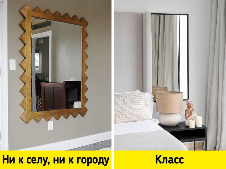Также специалисты не рекомендуют вешать овальные зеркала в спальне — они не гармонируют с продолговатым изголовьем кровати.