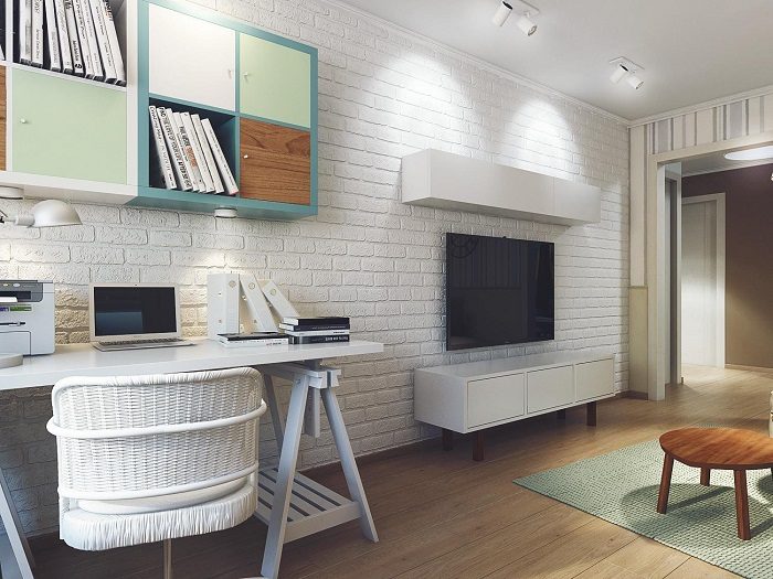 Если вы хотите, чтобы кроме традиционных зон в однокомнатной квартире также были оформлены рабочее место и туалетный столик для наведения красоты по утрам, советуем отказаться от идеи установить два стола, так как они займут все свободное пространство. Лучше объединить две зоны в одну и трансформировать их по необходимости – если использовать грамотное хранение, в этом не будет никакой сложности. Например, ноутбук и документы можно разместить в выдвижных ящиках, а на поверхности стола хранить органайзеры с косметикой и украшениями, складное зеркало и прочие милые женскому сердцу штучки. Или наоборот – все зависит от ваших требований и предпочтений.
