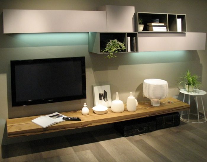 Возле стола можно будет поставить удобный раскладной диван, а в зоне телевизора, которая выделена оригинальной интерьерной подсветкой – разместить небольшое рабочее место (стола, кресла и компьютера будет достаточно).