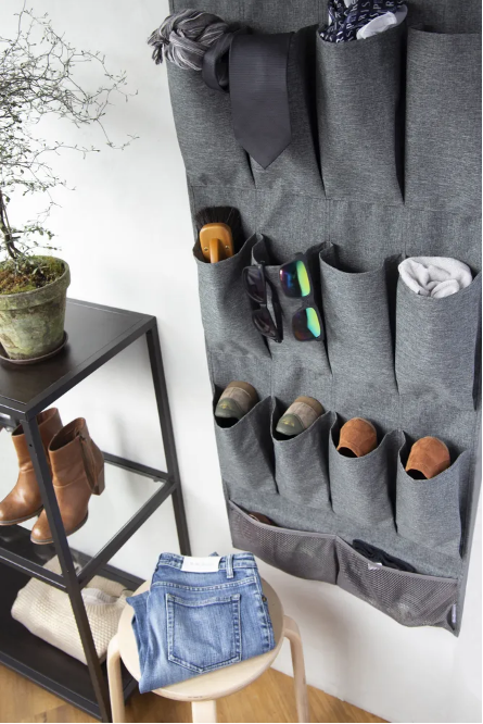 Поддерживать идеальный порядок в шкафу бывает крайне сложно, особенно когда каждый день собираешься по делам в лютой спешке. Наибольший беспорядок создают мелкие предметы: шарфы, галстуки, ремни, перчатки… Создайте для их хранения отдельное пространство: повесьте по разным углам, сложите их все в подвесной органайзер с кармашками. Его можно купить на любом маркетплейсе или сшить самостоятельно — это несложно. Останется лишь прикрепить органайзер к перекладине вешалки и повесить ее в шкаф.