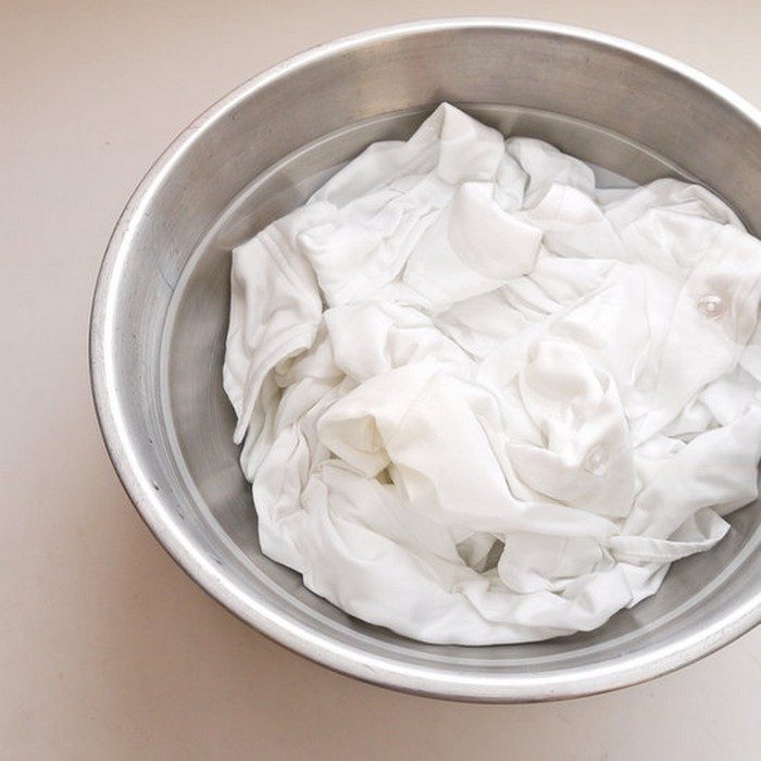 В миску налейте стакан уксуса и два стакана тёплой (не горячей) воды. Отправляйте туда белую вещь «откисать» на 20 минут.