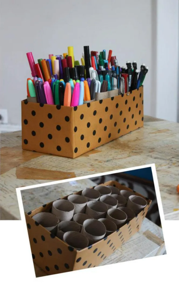Заполните обувную коробку оставшимися втулками от туалетной бумаги – проследите, чтобы их высота соответствовала высоте стенок коробки. Затем соберите все свои ручки, карандаши и фломастеры вместе и поставьте их в коробку из-под обуви. Выберите коробку подходящего размера, украсьте ее, если в этом есть необходимость, и теперь все ваши канцелярские товары будут всегда на виду!