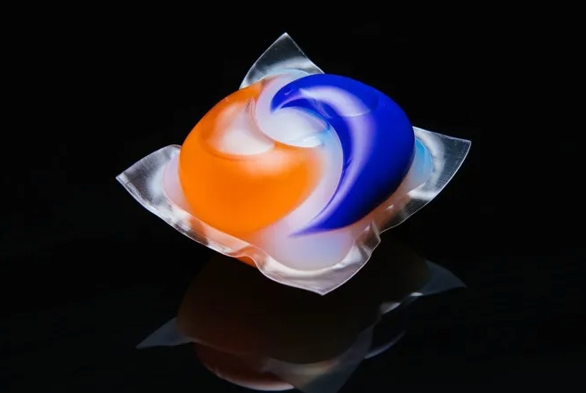 Начнем с того, что находится на поверхности, то есть с оболочки капсул. Она представляет собой пленку, обычно состоящую из поливинилового спирта (ПВА). Эта пленка легко растворяется в воде, высвобождая все содержимое капсулы. Для одежды — как и для стиральной машины — она совершенно безопасна.