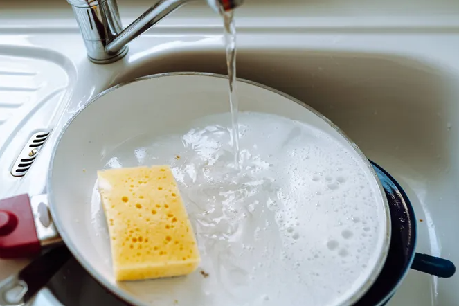 Если дно плохо отмывается, замочите сковороду, заполнив ее водой и добавив каплю средства для мытья посуды. Оставьте на 10-15 минут — пусть физика и химия делают свою работу.