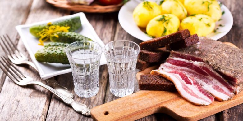 Идеально подойдут мясные, мясо-мучные и рыбные блюда, жирное, острое и солёное только приветствуется. Похлёбкин отмечал, что водка способствует усвоению подобной тяжёлой пищи, производя своего рода освежающий эффект: вы и не переедите, и не выйдете из строя раньше времени.