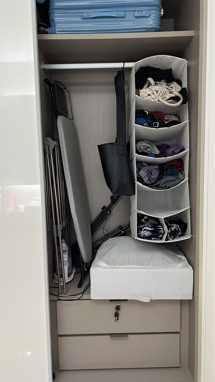 Например, въехав в свою последнюю квартиру, я долго применяла разные способы обустройства и раскладки вещей в шкафу: покупала дополнительные тканевые ящики, органайзеры, вешалки и испытывала конструкцию. И если что-то не работало, покупала новое. Пришлось потратить некоторое (не очень большое) количество денег, зато стало действительно удобно. И одежда на самом деле сразу отправляется по местам.